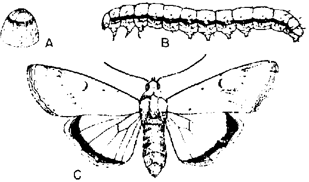 El Helotero (Heliothis zea) A - Huevo; B - Larva madura; C - Adulto