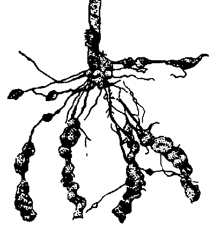 Unas agallas del nematodo de los nudos radicales en las raíces del frijol. Note como se diferencian de los nódulos por el hecho de ser parte de la raíz.