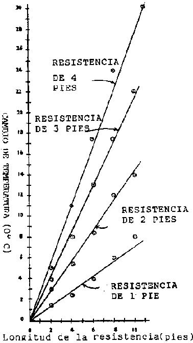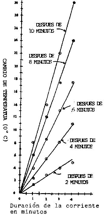 Instrumento: El instrumento consistió de un calorímetro, una bombilla de luz Bajaj de 50 vatios, y alambre de nicromo de 40 de espesor. Procedimiento: Se conectó la bombilla por medio de alambre de cobre en serie con dos trozos de alambre de nicromo, un trozo de 3' aislado. y uno aislado. y uno de 1' desnudo. Se colocó el trozo de alambre de nicromo desnudo en un calorímetro con 100 ml. de alcohol etílico (calor específico =.65). Se revolvió el alcohol hasta que pudo determinarse que la temperatura había alcanzado un valor de equilibrio. Entonces se conectó la corriente y se revolvió el alcohol constante pero suavemente. Se registraron las medidas de la temperatura a intervalos de dos minutos hasta por un total de 10 minutos. Se siguió el mismo procedimiento con trozos de 2', 3' y 4' de alambre de nicromo desnudo dentro del calorímetro. Cuando se tuvo el trozo de 2' de alambre de nicromo desnudo en el calorímetro, el trozo de 3' de alambre de nicromo aislado fuera del calorímetro fue reemplazado por un alambre de nicromo aislado de 2', manteniendo de este modo constante la resistencia eléctrica del instrumento (en consecuencia, la fuerza de la corriente en amperios se mantuvo constante). Correspondientemente, cuando se tuvo el alambre desnudo de 9' en el calorímetro, solamente se utilizó 1' de alambre aislado fuera de aquél, y no se utilizó ningún alambre aislado cuando el trozo de 5' se encontraba dentro.