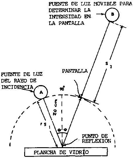 Procedimiento: El experimento se llevó a cabo en un cuarto oscuro. Se colocó una fuente de luz a una distancia de 20 cm. del punto de reflexión y a un ángulo de 10 grados en relación a la perpendicular en ese punto. También se colocó la pantalla de papel a una distancia de 20 cm. del punto de reflexión, en una posición que interceptaba el rayo reflejado. En el costado de la pantalla opuesto al del espejo se colocó una fuente de luz cuya distancia fue adaptada hasta hacer que la mancha de grasa desapareciera. Se registró esta distancia (de la pantalla a la segunda fuente de luz). Se repitió este procedimiento tres veces para cada uno de los siguientes ángulos (con respecto a la perpendicular): 10°, 20°, 30°, 40°, 50°, 60°, 70 y 80°.