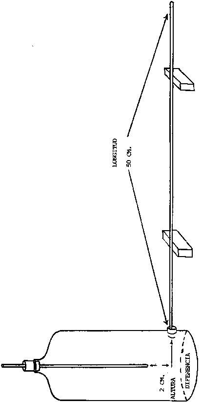 Instrumento: El instrumento consistió en una botella de boca angosta con un agugero en uno de sus lados cerca del fondo. Se aseguró un tubo de vidrio (longitud 50 cm., diámetro 0.2 cm.) a este agujero por medio de un corcho. Se sellaron los lugares de posibles fugas. En la parte superior de la botella se colocó un tapón con un agujero que sostenía un tubo de vidrio cuyo extremo inferior se encontraba a 2cm. sobre el nivel del tubo horizontal. Si no se sella el tubo vertical y la botella está llena de líquido, entonces el líquido tiene una velocidad de flujo constante a través del agujero en el costado de la botella.