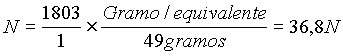 Ya que el peso de un gramo-equivalente de H2SO4 es 49 gramos, la normalidad de la solución comprada se calcula de la misma manera que la molaridad, excepto que el peso del H2SO4 por litro de solución se divide por el peso equivalente del ácido.