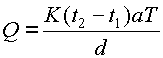K es una constante que depende de la naturaleza de la substancia, designada como la conductividad de calor especifico. K es normalmente dada para Q en calorías, t1 y t2 en °C, a en cm , T en segundos, y d en cm.