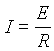 Ley de Ohm: La corriente en términos de fuerza electromotriz E y resistencia R,