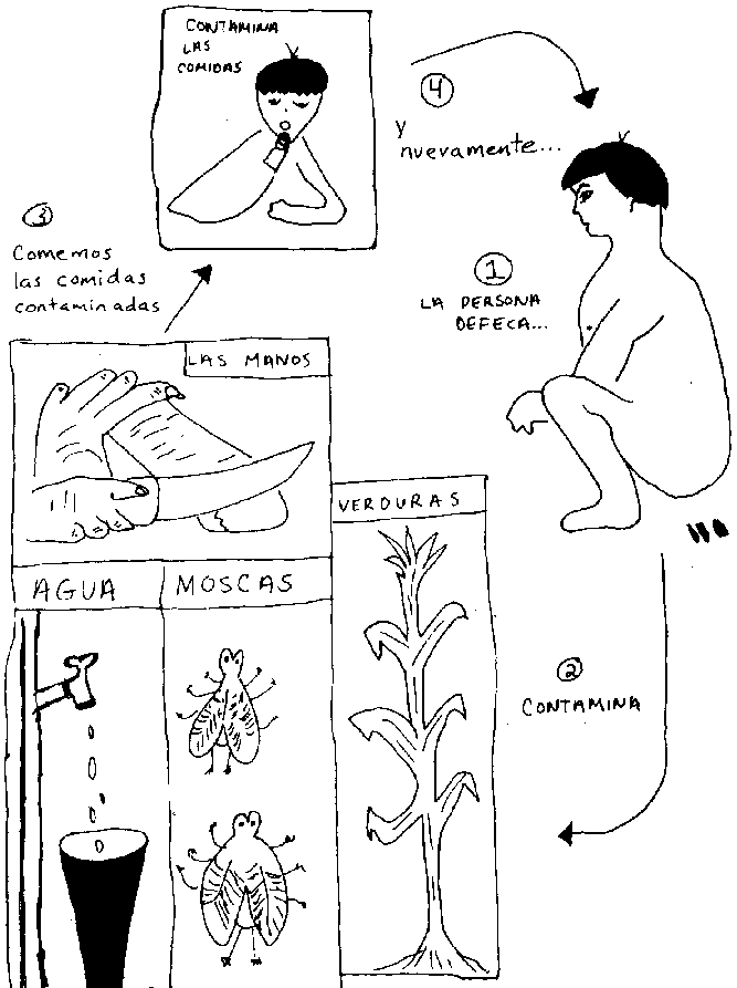 La familia de José no tiene letrina. Ellos saben hacer sus necesidades en el campo, no más. Donde José deja sus excrementos (caca), deja también los microbios que han causado su enfermedad. Empieza a llover y la lluvia arrastra los excrementos de José al río. La caca de José llega al chorro de agua que todos en el barrio usan. El agua contiene los microbios de la enfermedad de José y algunos en el barrio se enferman con el mismo dolor de estómago y diarrea que tiene José.