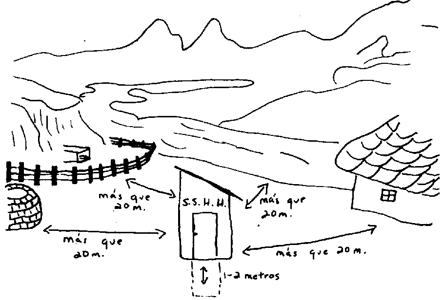 Para no contaminar, la letrina debe quedar por lo menos a 20 metros de la escuela, las casas, fuentes de agua, o de ríos. Si la letrina queda cerca del río, asegúrese de que quede RIO ABAJO de donde sacan el agua.