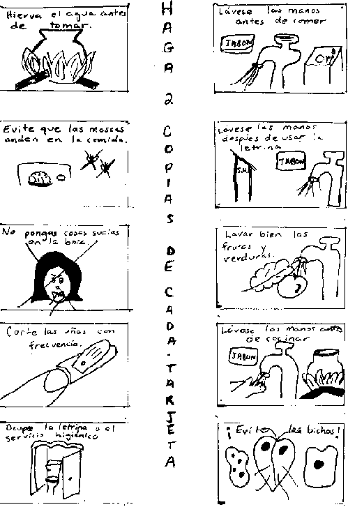 Para este juego, se necesitan 10 tarjetas con dibujos enseñando maneras de prevenir los bichos. Tiene que hacer 2 copias de 10 dibujos diferentes. Vea la siguiente página para ejemplos de las 10 tarjetas.