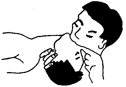 c. Ciérrele las narices con sus dedos. Abrale bien la boca, tápela con la suya y sople con fuerza para inflar los pulmones. Deje que salga el aire y vuelva a soplar. Repita esto más o menos 15 veces por minuto en un adulto. En un niño de edad es colar, sople 20 veces por minuto. En recién nacidos, sople 25 veces por minuto (con poca fuerza).
