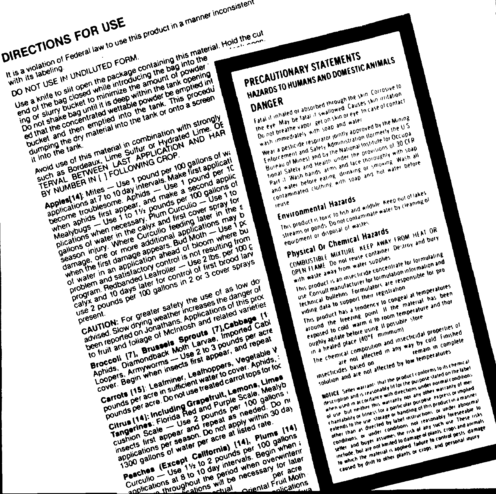 All labels have a DIRECTIONS FOR USE section that tells you how to mix and apply the pesticide safely. This section also tells you what crops, animals or arcas the pesticide can be used on safely. The PRECAUTIONARY STATEMENT section on the label gives safety information to help prevent accidents to yourself, others and damage to the environment .