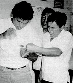 TAE Jorge García recibiendo pinchazo de parte de su compañero Fernando Velásquez en demostración de como sacar muestra de Gota Gruesa.