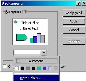 Click the down arrow in the Background dialogue box and then select More Colors... from the drop down menu which appears as shown below: