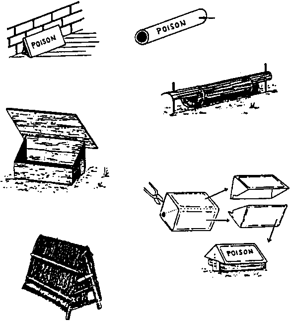 Care should be taken that the bait does neither absorb any moisture nor dry out. Bait boxes for placing outdoors should have legs and a waterproof roof in order to protect them from ground moisture and rain. A number of examples of bait boxes are shown in the following illustration: