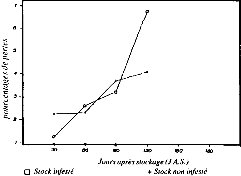 Enfin, pour mieux se préparer à la lutte biologique contre P. truncatus, le Service National de Protection des Végétaux a engagé depuis 1989, une étude d'évaluation des dégâts et pertes causés par le parasite dans les greniers traditionnels de maïs. Cette évaluation a permis de constater en 1989 que les pertes occasionnées par les parasites des stocks sont importantes dans les stocks infestés par P. truncatus (20,5% après 6 mois de stockage) (Fig. 7 et 8).
