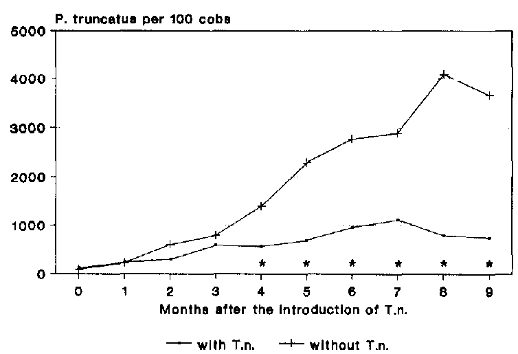 If the abundance of T. nigrescens is related to the population of P. truncatus a prey-predator ratio of 1:1.2 after 9 months is produced. Although a very close prey-predator ratio of 3.6:1 was determined at the beginning of the experiment, in comparison to surveys under practical conditions in Costa Rica (see BÖYE, 1988), this ratio became even closer during the course of the experiment.