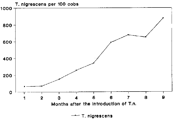 T. nigrescens evidently had no serious problems in adapting to the new environmental conditions (Fig. 19). The population increased during the whole course of the experiment and, after 9 months, reached am average density of 876 adult specimens per 100 cobs.