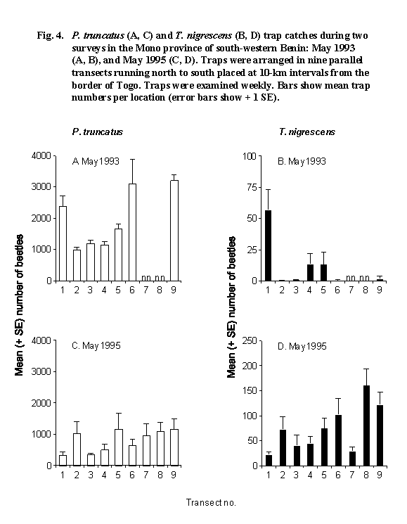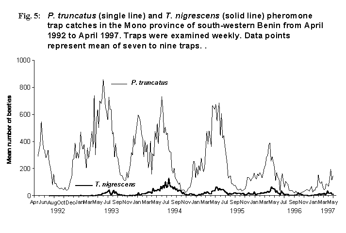 When the flight activity of P. truncatus and T. nigrescens in the Mono province was monitored between April 1992 and October 1997 (Fig. 5), the flight activity of P. truncatus was strongly seasonal, with two peaks in trap catches, especially in the early years of the study. The first peak occurred between the end of December and the end of February, during the major dry season in southern Benin, and the second one between April and June, during the first part of the rainy season. The lowest flight activity of P. truncatus was always recorded in October. The December to February peaks of 1994-1995 and especially of 1995-1996 and 1996-1997 were notably lower than in previous years. Moreover, the April to June peak in 1996 and the flight activity in April and May 1997 were strikingly low compared with the previous years.