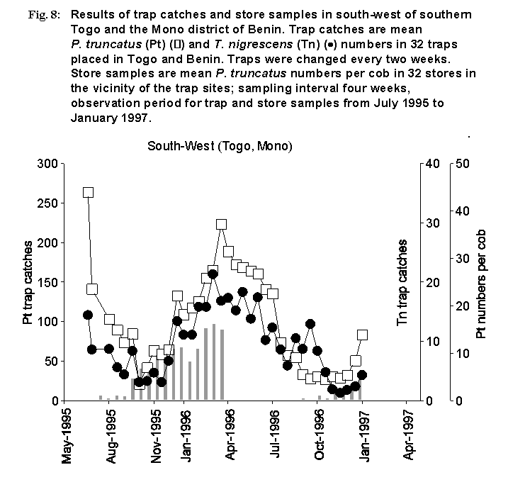 The results from the four consecutive on-farm storage experiments clearly demonstrated a very considerable reduction of P. truncatus infestation, accompanied by a reduction of grain losses and increasing T. nigrescens densities. The maximum level of grain losses recorded in the 1994-1995 and in the 1995-1996 trial corresponds well with the average grain losses after six months of storage reported for southern Togo prior to the introduction of P. truncatus (Pantenius, 1987). Mutlu (1994), in her study in southern Togo, found lower P. truncatus infestation in grain stores in villages where T. nigrescens had been released, compared with non release villages.