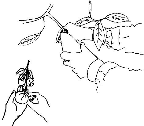 Some fruits need to be clipped or cut from the parent plant. Clippers or knives should be kept well sharpened. Penduncles, woody stems or spurs should be trimmed as close as possible to prevent fruit from damaging neighboring fruits during transport.