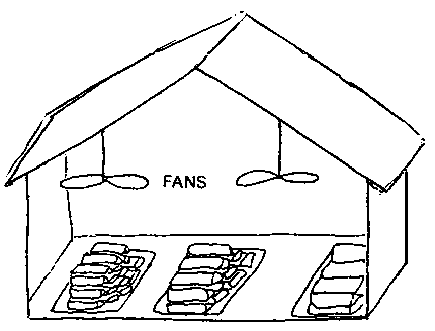 Curing using a bulk system requires a fan, a heating unit and a slatted floor. The illustrations below shows how air can be brought in, heated and distributed through a load of bulk onions in the curing room An exhaust opening near the ceiling recirculates heated air.
