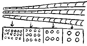 Several types of mechanical sizers are available for small scale operations. One type is composed of a long slanted tray with a series of openings which converge (largest at the top, smallest at the bottom). This type of sizer works best with round commodities. Other sizers are designed as conveyors fitted with chain or plastic belts with various sized openings, and are useful for sizing most commodities. Another simple method for mechanical sizing is to use a set of diverging bar rollers (see illustration below), where the smallest sized produce falls through the rollers first to a sorting belt or bin, and larger sized produce falls between successively more divergent rollers.