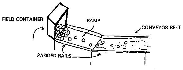 Any time produce is dumped from one container into another, care should be taken to reduce mechanical damage to the commodity. When dumping produce from field bins or from transport vehicles into the packinghouse, dry or wet dumping can be practiced. When using dry dumping practices, the filed container should be emptied slowly and gently onto a tilted ramp with padded edges. In the illustration below, a conveyor belt then carries the dry dumped produce into the packinghouse.