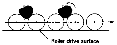 The following illustrations represent three types of conveyors used to aid sorting of produce. The simplest is a belt conveyor, where the sorter must handle the produce manually in order to see all sides and inspect for damage. A push-bar conveyor causes the produce to rotate forward as it is pushed past the sorters. A roller conveyor rotates the product backwards as it moves past the sorter.