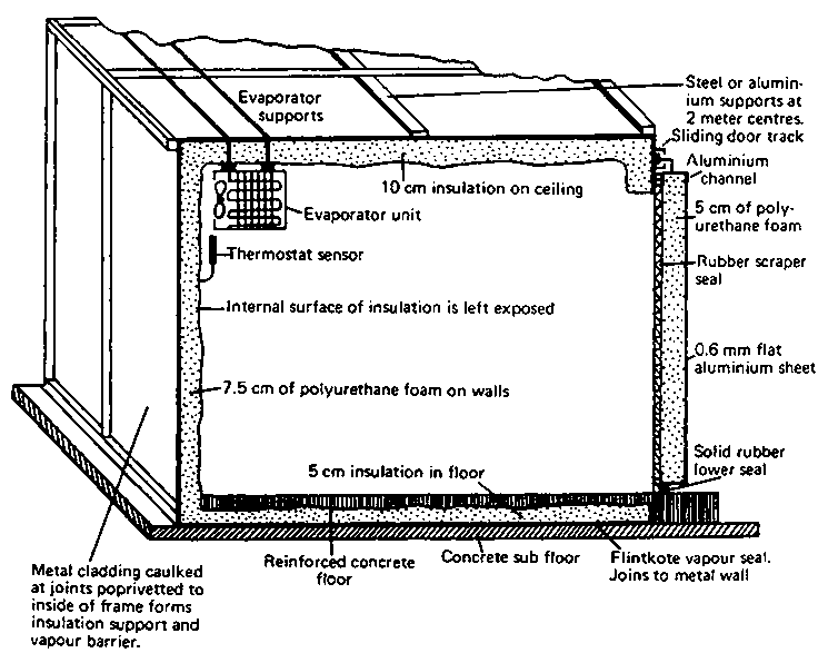 Low cost cold rooms can be constructed using concrete for floors and polyurethane foam as an insulator. Building the storeroom in the shape of a cube will reduce the surface area per unit volume of storage space, thereby reducing construction and refrigeration costs. All joints should be calked and the door should have a rubber seal.