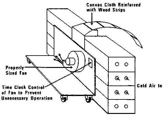 A portable forced-air cooler can be constructed using a canvas or polyethylene sheet. The sheet is rolled over the top and down the back of the boxes to the floor, sealing off the unit and forcing air to be pulled through the vents (vent area should be at least 5% of the surface area of the carton) of the cartons stacked against the cooler. This unit is designed to be used inside a refrigerated storage room.