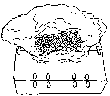The low cost cooling chamber illustrated below is constructed from bricks. The cavity between the walls is filled with sand and the bricks and sand are kept saturated with water. Fruits and vegetables are loaded inside, and the entire chamber is covered with a rush mat, which is also kept moist. Since a relatively large amount of materials are required to construct this cold storage chamber, it may be useful only when handling high value products.