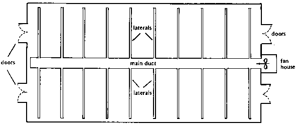 Ducts for ventilation of bulk storage rooms can be laid out vertically as well as horizontally. The storeroom for potatoes shown below provides for plenty of ventilation using simple materials. The room can be of any size or shape since air ducts can be positioned to extend evenly throughout.
