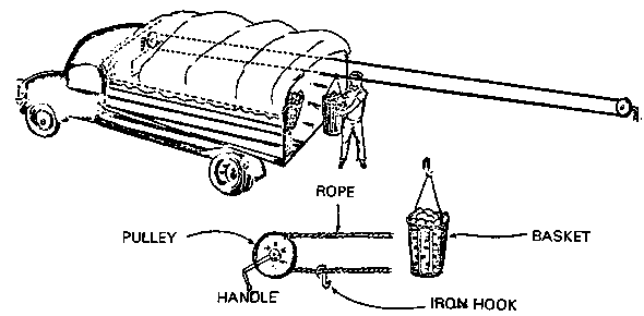 A simple device for easing the work of unloading transport vehicles can be constructed using a two pulleys and a strong rope. One pulley can be mounted inside the truck at the front of the bed, the second outside on a portable post or on a stationary object like the side of a building. Containers can be hung directly by their handles or placed into a sling.