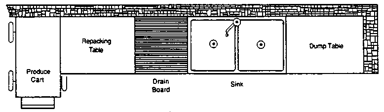 Some produce may require washing, trimming, bunching or sorting at the wholesale or retail market level. The layout of the work station used for handling produce at destination should be organized to minimize non-productive movement. In the illustration below, a dump table is located next to a sink for washing produce, and the drain board is positioned directly next to the sink. Once produce has dried, cartons can be packed and placed onto a cart located right next to the repacking table. With this layout, a single operator could easily perform all the handling steps or several handlers could work side by side.