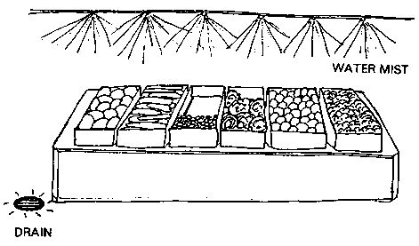 High relative humidity can be maintained during display by misting leafy vegetables and water tolerant crops with clean, cold water. A simple sprinkler device can be constructed by perforating a pipe with tiny holes and connecting it to a hose. If this display is used outdoors, shade should be provided.