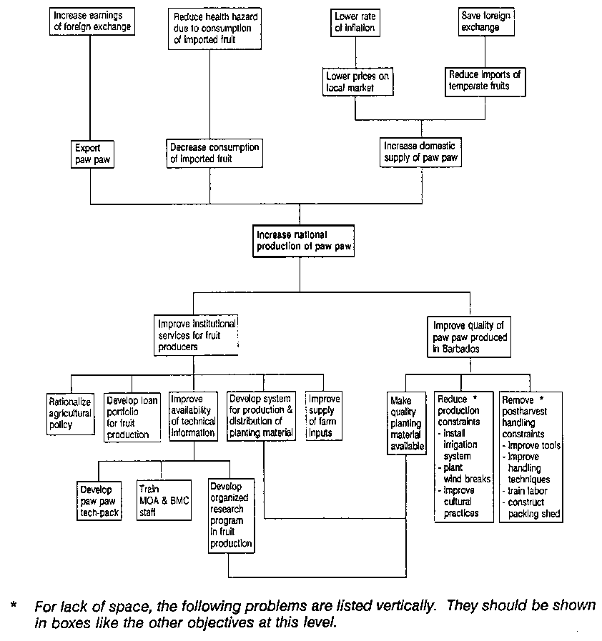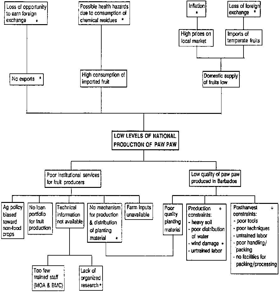 Figure 5.1 presents the information from Table 5.1 in a problem tree format. In this case the core problem is stated as "Low level of national production of paw paw." The causes of this core problem, as indicated in Figure 5.1, are due to: "poor institutional services for fruit farmers," on one hand, and "low quality of paw paw," on the other. The causes of each of these respective problems are identified at lower levels of the problem tree. Problems which were not identified in Table 5.1, but resulted from discussion during the preparation of the problem tree, are indicated with an asterisk (*).