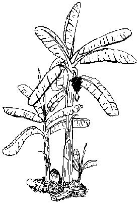 Banana plants grow well throughout the South Pacific, even on most atolls. In order to bear large crops, banana plants must be properly looked after and must not be overcrowded. The illustration on the left shows how they should be thinned. They are grown by planting corms, or suckers, taken from the base of old plants.