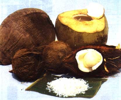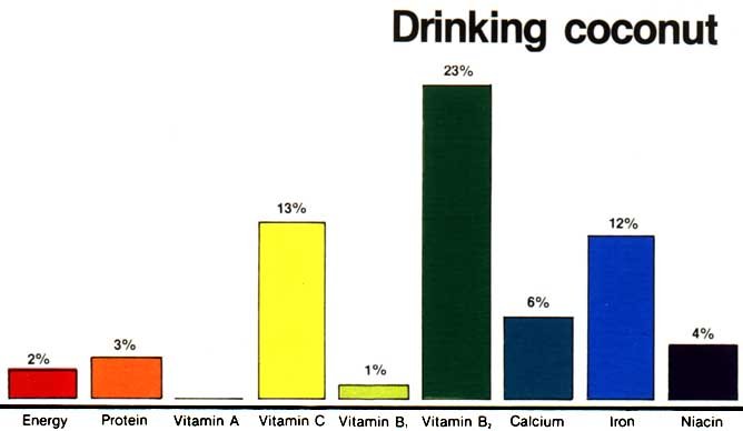 The water from green nuts is used for drinking and soups. If someone has diarrhoea, drinking coconut water replaces fluids and minerals that the body has lost. The flesh is soft and spongy, making an excellent baby food.