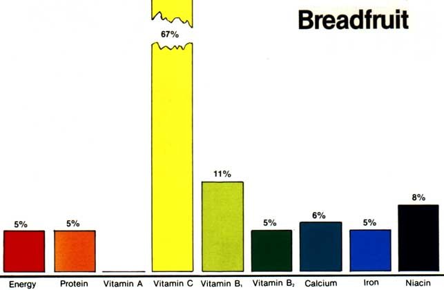 Breadfruit is an energy food. Starch and sugar make breadfruit high in energy which the body needs for warmth, work and play. Breadfruit is a fair source of Vitamin C. This vitamin keeps the body tissues strong, helps the body to use iron, and aids in chemical actions in the body.