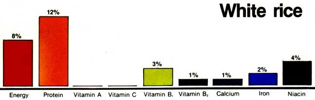 Polished white rice provides some energy and protein, but fewer vitamins and minerals than breadfruit. Rice should not be eaten alone, but should be mixed with vegetables and meat or fish.