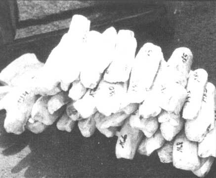 At the beginning of the storage season, a total of 300 dried cassava chips was drawn from all storage structures involved in the trials at the farms and at the station. These chips were assessed with the four different loss-assessment methods. The cassava chips used during the eight-month loss study, as reference samples, were weighed in groups for each structure at the beginning of the survey. Each chip was labelled and analysed for weight and visual damage. The moisture content was determined, and a qualitative assessment of cyanide and starch content was also carried out. Each storage structure, at the farm and at the station then contained about 200 labelled chips, including a proviso of 40 chips in case chips were missing or consumed. The farmers were then asked to mix their stored produce with the labelled chips thoroughly. Each labelled chip retained its identity as to date collected. Farmers were paid in advance for the cassava chips collected during the loss-assessment survey. They were also asked to register the removal of chips from their storage structures and to give an estimation of the entire amount of cassava chips stored at the beginning of the storage season (see Figures 31 and 32).
