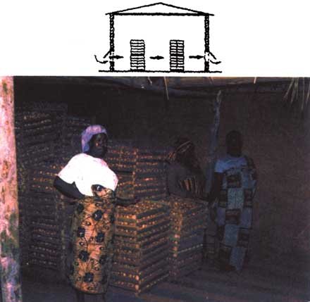 The principle of naturally convected air ventilation was applied to the storage of potatoes in warehouses of 7-20 tonne capacity. The structures were built of mudblock walls with a galvanised corrugated sheet steel roof. Controllable ventilation louvres, each 70cm x 30cm, were built into the two long walls, those at the windward side were 50 cm above the ground, those on the opposite wall were built at about 30 cm below the eaves level. There was at least one pair of louvres (inlet and outlet) for every three linear metres of wall. A ceiling of bamboo or raffia was built under the roof on which was placed a 30 cm thick layer of packed straw to insulate the building from the heat radiated from the metal roof. Mudblocks were preferred to cement blocks because their insulation was greater. The ventilation louvres were opened only at night. The average internal store temperature was 14.5ºC with a mean minimum outside air temperature (at night) of 10ºC and a mean maximum outside air temperature of 30ºC (Toet, 1982).