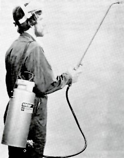 Hand-operated knapsack sprayers should be fitted with fan spray jets, although a swirl nozzle of similar output can he used. The nozzle should have an output rate of 0.85 l/min at a pressure of 2.1 kg/cm2 (30 psi). When spraying wettable powders, the filter behind the nozzle should be removed. When applying suspensions, the most suitable ceramic fan jet is size 0 and for emulsions size 000 should be used. This reduces the output at 2.1 kg/cm2 (30 psi) to