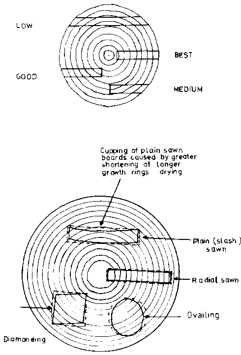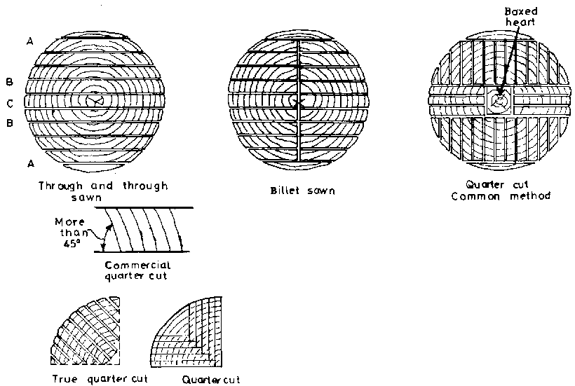 Radially sawn boards shrink less and are less liable to cup and twist and are easier to season. Unfortunately, methods of cutting which produce a high proportion of quarter sawn timber are wasteful and therefore only used to produce material for high-class joinery work. See Figures 3.2 and 3.3.