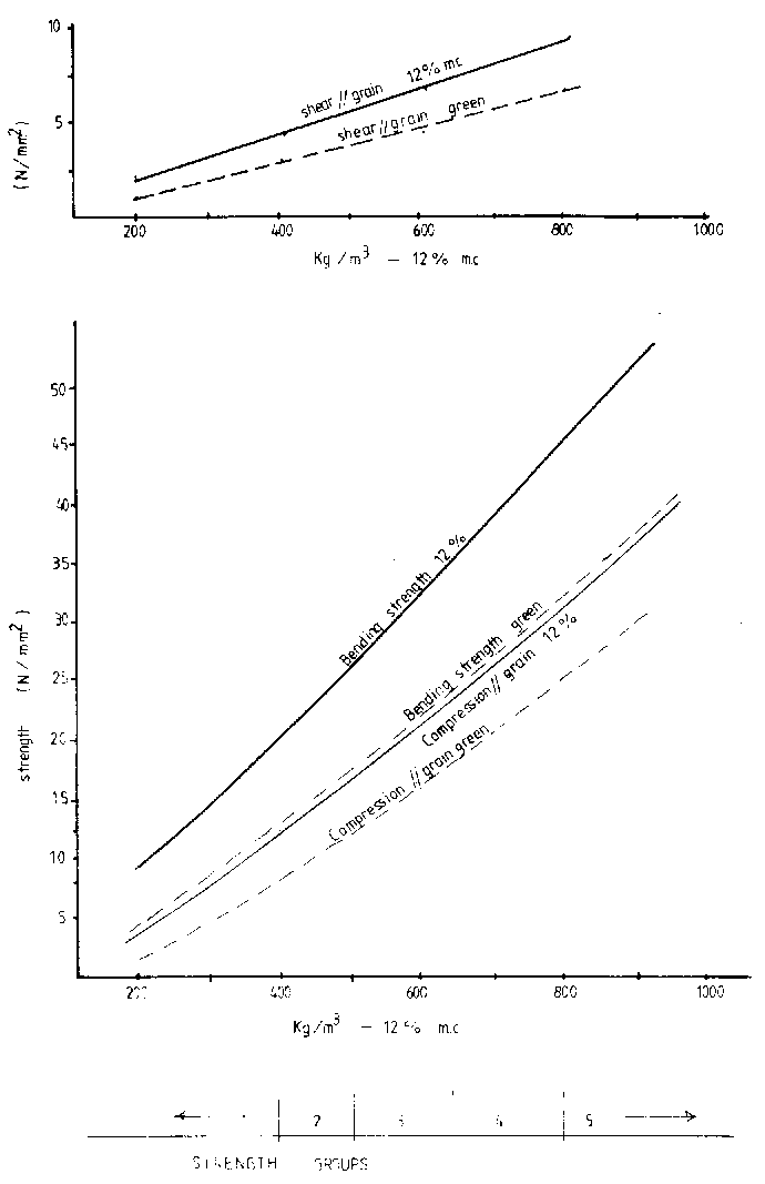Strength group Strength rating Density green Density 12% M.C. Max. bending strength and tension to grain Modulus of elasticity Maximum ompression strength Max. shearing strength