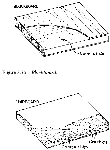 Blockboards and laminboards are made of strips of wood from 8 to 25mm wide, glued together and covered with one or more veneers on each side. At least one pair of corresponding veneers will have the grain at right angles to the grain of the core. Thus, if the finish grain is to run parallel with the core, there must be at least two veneers per side.