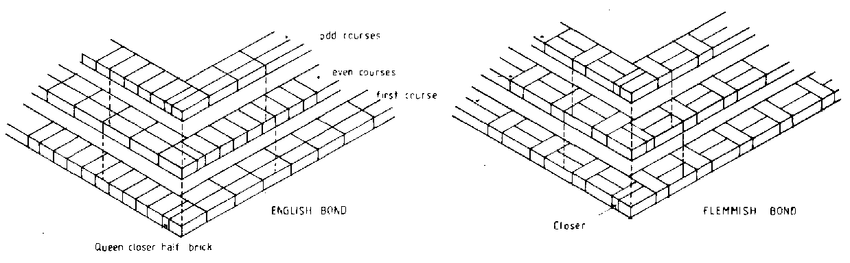 The two bonds most commonly used for walls one brick and over in thickness are known as English bond and Flemish bond. A 'one-brick thickness' is equal to the length of the brick. These bonds incorporate both headers and stretchers in the wall which are arranged with a header placed centrally over each stretcher in the course below in order to achieve a bond and minimize straight joints. In both bonds 120 bricks of standard size are required per m˛ of 23cm wall. This figure allows for 1 5 to 20% breakage and 1cm mortar joints. Figure 5.19 illustrates English and Flemish bonding.