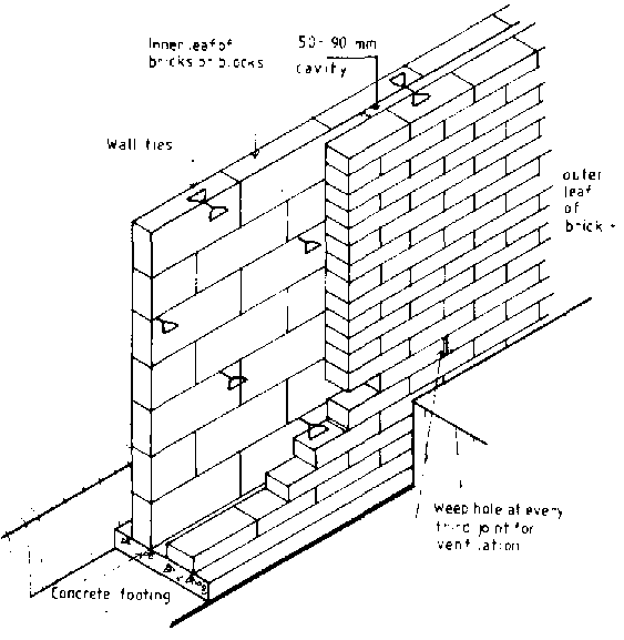 Bricks are sometimes used in the construction of cavity walls since the airspace improves the thermal resistance and the resistance to rain penetration compared to a solid wall of the same thickness. Such a wall is usually built up with an inner and outer leaf in a stretching bond, leaving a space or cavity of 50 to 90mm between the leaves. The two leaves are connected by metal wall ties spaced 900mm horizontally and 450mm vertically as shown in Figure 5.20.