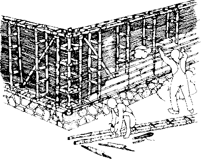 Figure 5.27 Construction of a rammed-earth wolf with a gliding form.