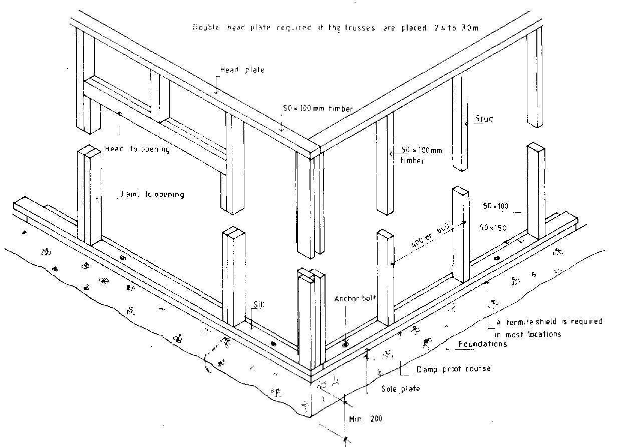 Frame construction using timber must be raised out of contact with ground moisture and protected from termites. This is accomplished by erecting it on a base wall or foundation beam rising to a damp-proof course, or on the edge of a concrete slab floor. As a base for the whole structure a sill is set and carefully levelled on the dampproof course and securely anchored to the foundation. To maintain the effectiveness of the dampproof course it must be sealed carefully at all bolt positions. A continuous termite shield should be installed between the damp-proof course and the sill and great care taken to seal around the holes required for the anchor bolts. The sill plate may be 100mm by 50mm when fixed to a concrete base, but should be increased in width to 150mm on a brick base wall.