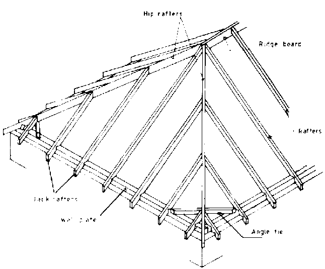 A hip roof has a ridge in the centre and four slopes. It is much more complicated in its construction, necessitating the cutting of compound angles on all of the shortened rafters and the provision for deep hip rafters running from the ridge to the wall plate to carry the top ends of the jack rafters. The tendency of the inclined thrust of the hip rafters to push out the walls at the corners is overcome by tying the two wall plates together with an angle tie. At the hips and valleys the roofing material has to be cut at an angle to make it fit. The valleys are prone to leakage and special care has to be taken in the construction.