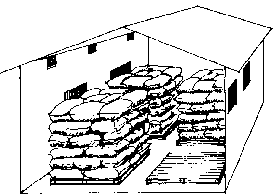 If the bags are stored in a multi-purpose farm shed or even in the farmers dwelling they should be kept out range from rats and mice. A raised free-standing platform equipped with ratguards will serve the purpose.